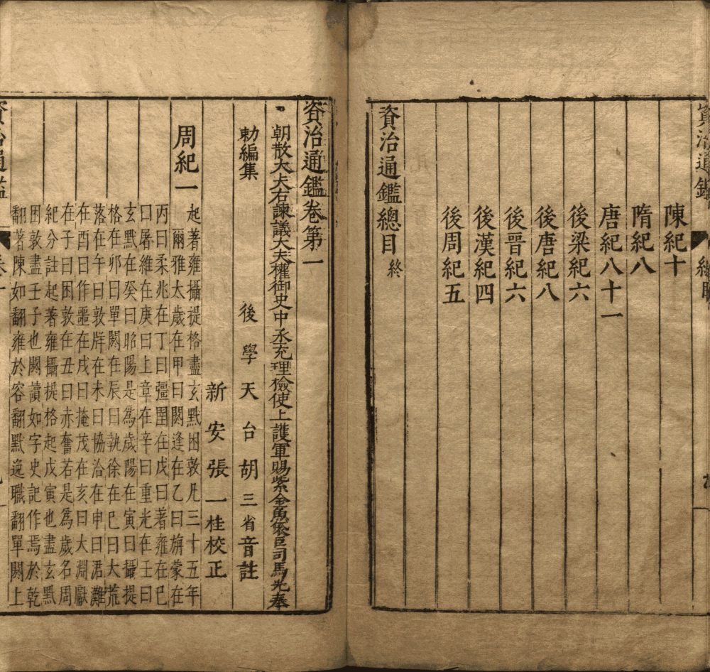 卷一前题:朝散大夫右諫議大夫權御史中丞充理檢使上護軍賜紫金魚袋臣司馬光奉敕編集 後學天台胡三省音注、新安張一桂校正]