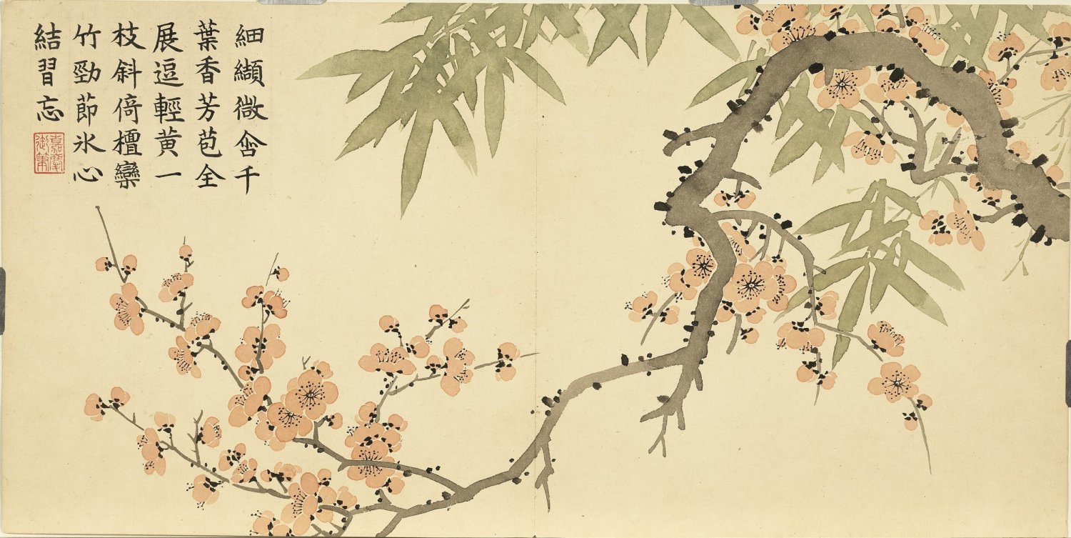 画册以梅花为主题,共十二开:红梅花、月映梅花、绿萼梅天竹、黄梅绿竹、梅花月季、临水梅花、梅花腊梅山茶、红绿梅花芝草、红梅栀子花、古梅、梅花竹叶、红梅水仙。此为清嘉庆九年绘本,现藏于台北故宫博物院。