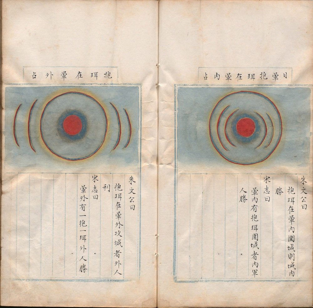 此彩绘精钞本《天元玉历祥异赋》搜集了天、地、日、月、五星、彗星、流星、风雨虹霓等大气现象,以及与之对应的古代占星术内容,并用彩图描绘这些天文奇观。